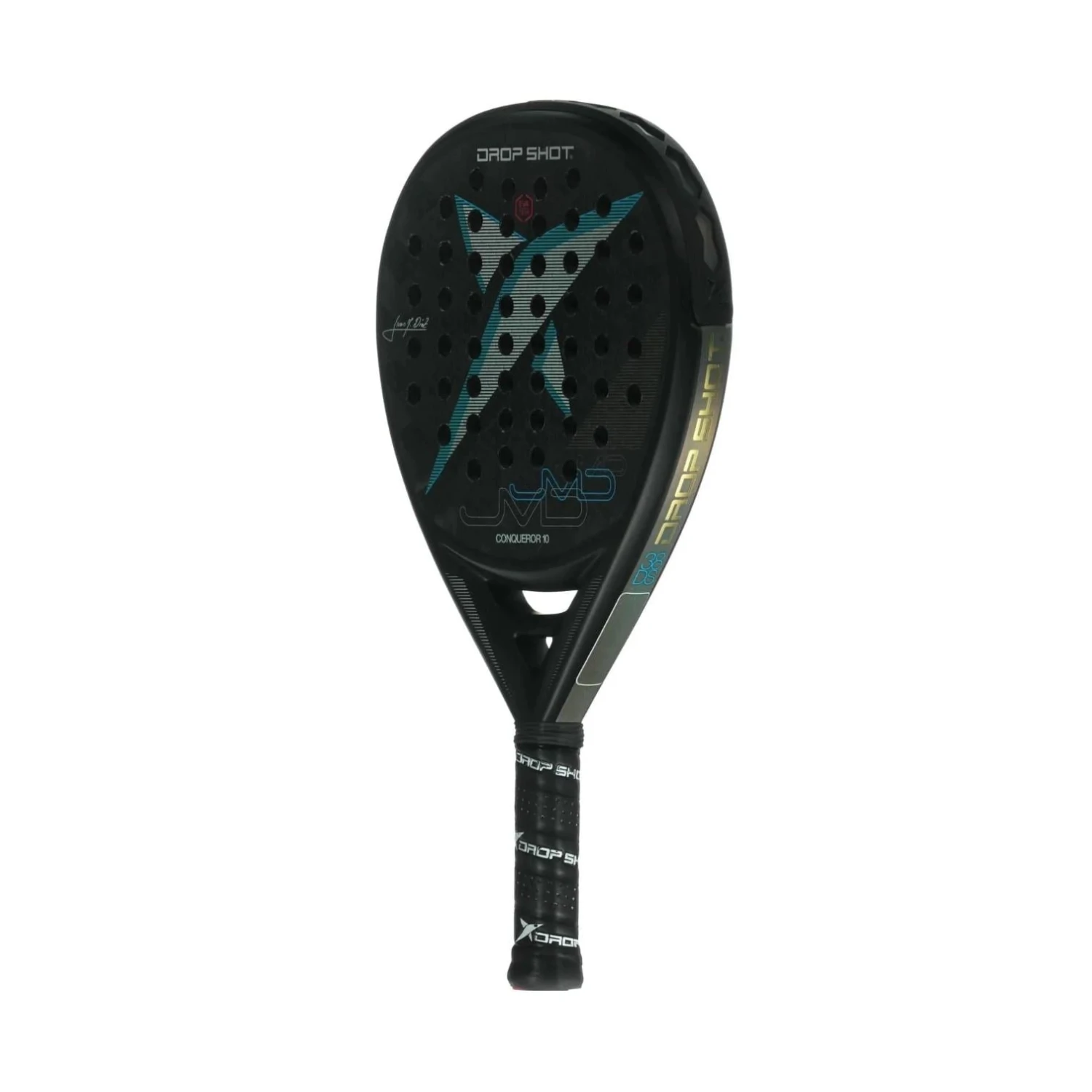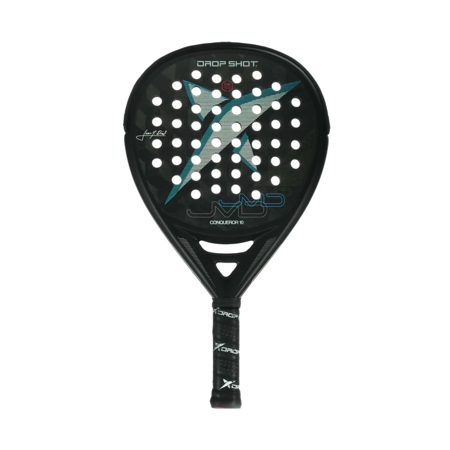 Drop Shot Conqueror 10 2022 is a teardrop-shaped padel racket used by the legendary Juan Martín Díaz, who plays on the professional World Padel Tour. This is the latest version of the popular Drop Shot Conqueror 10, which has taken its predecessors into account; the racket has retained its teardrop shape and it has a medium-high balance that ensures you a versatile combination of control and hitting power.