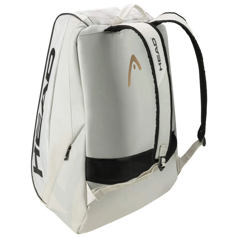 The Head Pro X Paddle Bag L YUBK comes in a luxurious, modern, off-white design and offers both style and space. The bag has two exterior bat compartments, one of which protects against extreme temperatures. In addition to a main compartment and a shoe compartment, it has two exterior zippered pockets and an interior accessory pocket. With a backpack-like carrying system, you can carry your gear comfortably. As an example of how Head is trying to reduce plastic consumption, the handle is made of recycled paper and tied with hemp cord.