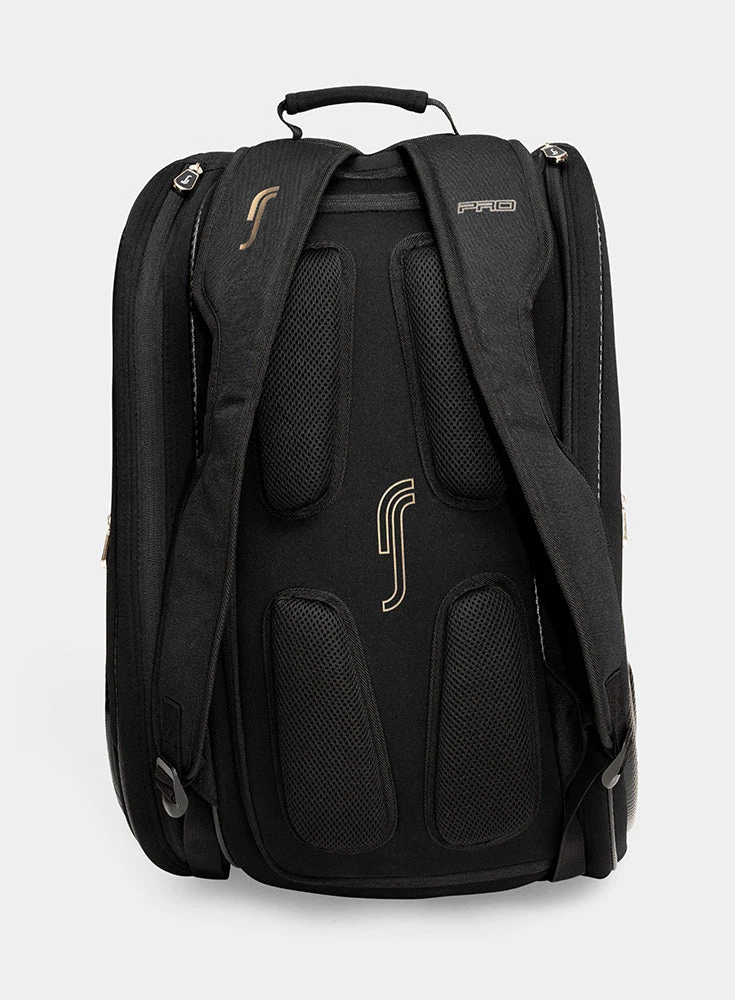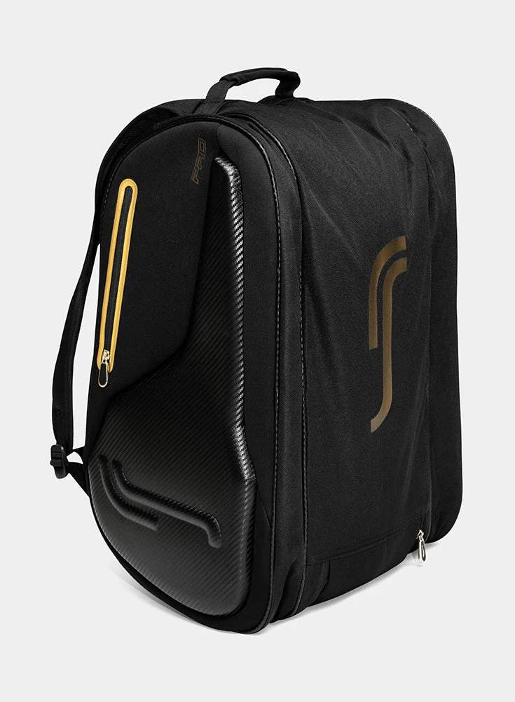 RS Pro Padel Bag in black with gold details. The bag has enough space for everything you need at the padel court and has a seperat thermo compartment to protect your rackets from temperatures and moisture. The bag has a large central compartment and a seperat shoe compartment as well. The bag is developed by RS and their pro players Simon Vasquez and Cayetano Rocafort while the looks are inspired by sport and fashion.